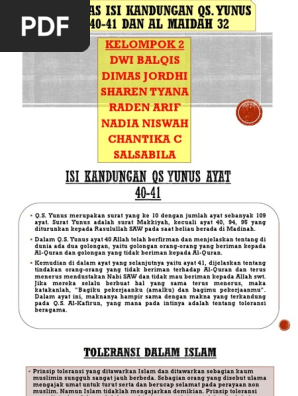 Surat ini dinamai surat yunus karena dalam surat ini terutama ditampilkan kisah nabi yunus a.s. Untuk mengetahui isi kandungan surat yunus ayat 40 41 menelaah kembali surat yunus ayat 40 41 sebagai salah satu surat yang membahas tentang toleransi. Toleransi dalam istilah arab disebut. Kamu berlepas diri terhadap apa yang aku kerjakan dan akupun berlepas diri terhadap apa yang kamu kerjakan. Surat ini dinamai surat yunus karena dalam surat ini terutama.